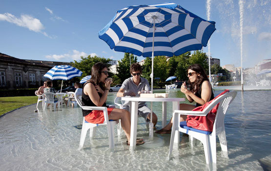 Novou formou rozvoje vesmíru v portugalském městě Guimarães jsou veřejná koupaliště a hřiště přímo ve fontánách. Plastové stoly, židle a lehátka jsou umístěny ve vodě, na některých místech plovoucí míčky, nafukovací kruhy a gumové kačenky – plavat nebo hrát si může každý. Finanční náklady jsou minimální, obyvatelé města jsou spokojeni, říká kancelář LIKEarchitects, která projekt vyvinula společně s módním návrhářem Ricardem Duradem. „Staré fontány jsme proměnili ze zapomenutých objektů městského prostředí na pohodlná a oblíbená veřejná místa, čímž jsme přinutili občany změnit svůj postoj k městu a zpochybnit zažité stereotypy,“ uvádí web úřadu.
